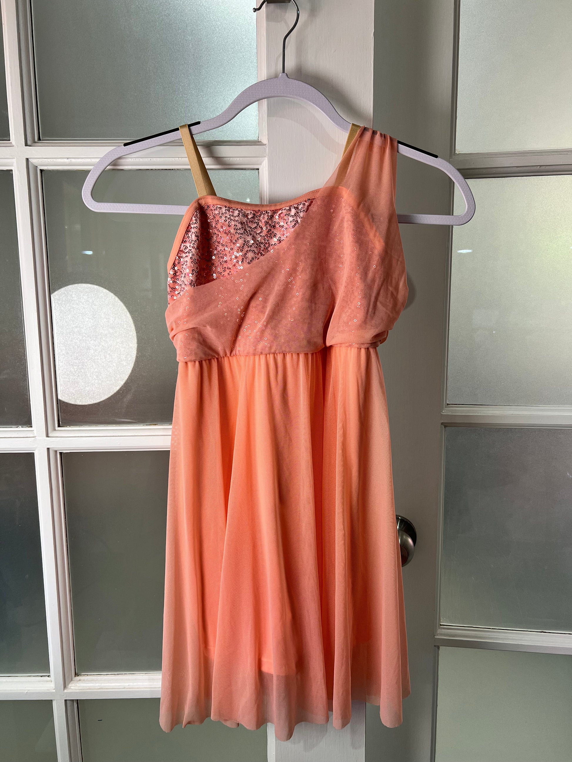 This soft sherbet-pink lyrical dress has that classic floaty silhouette works for so many routines, with a gentle mesh overlay that moves beautifully in turns and leaps. And that little sequin detail at the neckline? Just enough sparkle to catch the lights without screaming for attention. ✨