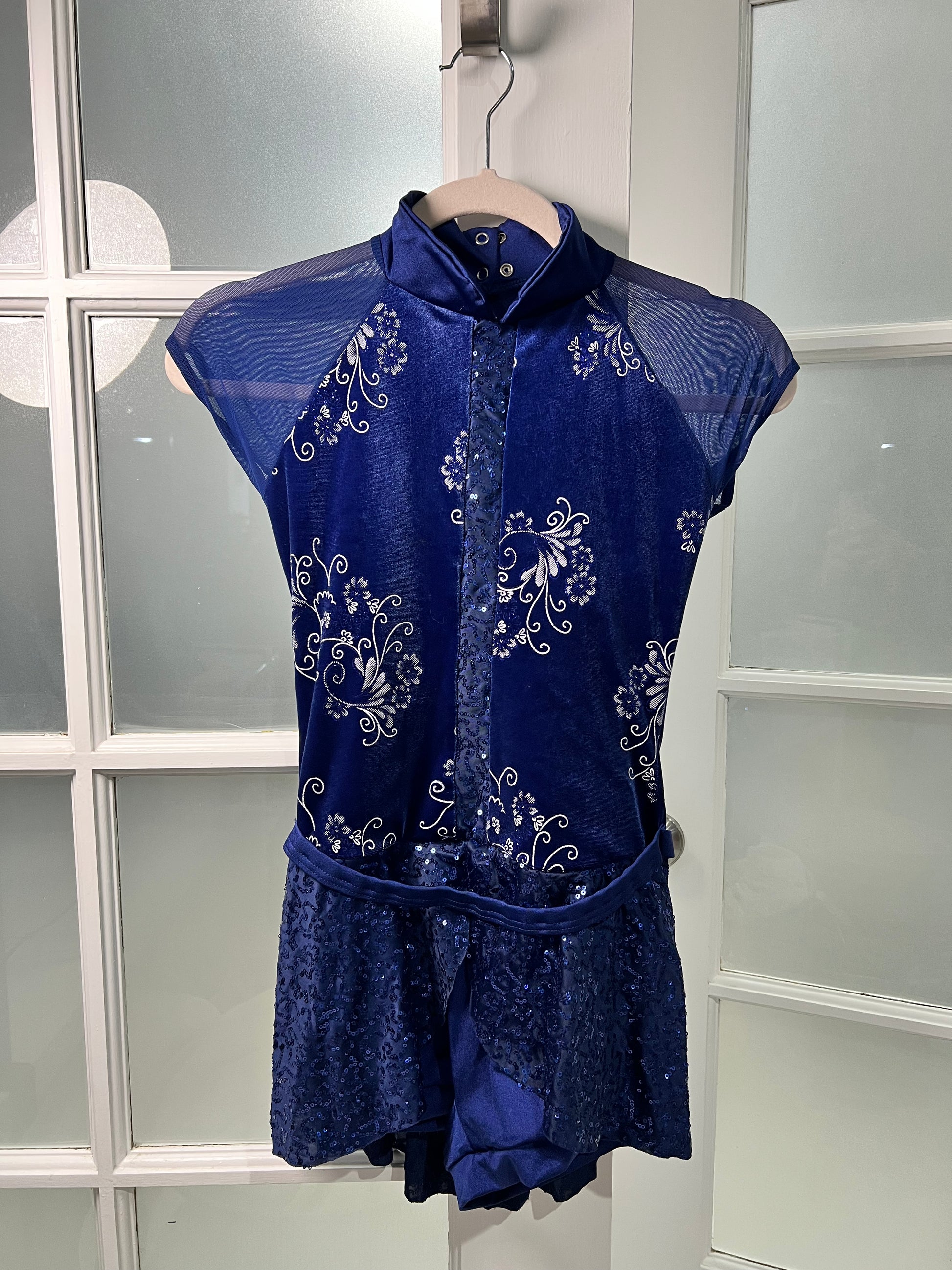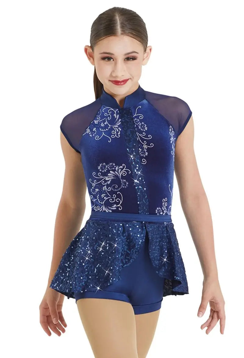 - Mandarin collar biketard has a bodice made of glitter floral velvet