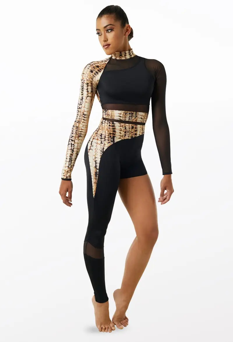 - Long sleeve unitard with matte nylon/spandex bodice and bottoms with power mesh insets